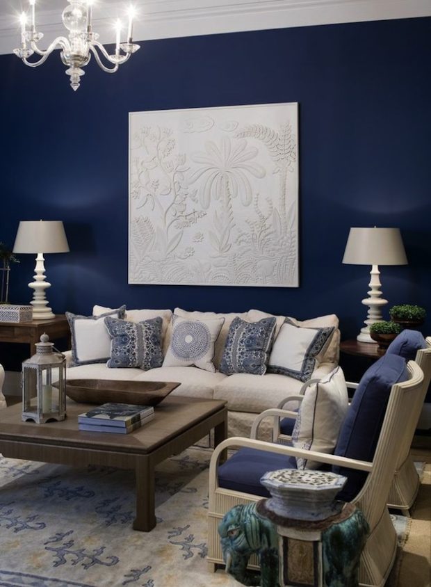 Des tons sombres suggèrent assez de lumière de jour et artificiel. Prenez la peine d'assurer cette condition, et vous pourrez alors éviter la sensation de murs de pression. Pour petits salons Une excellente option serait d'utiliser le bleu comme petit accent, mais vous pouvez utiliser une palette plus sombre et plus saturée. Le bleu pâle combiné à une couleur crémeuse créera composition harmonieuse qui sera complétée avec succès par de grands vases de sol aux tons cobalt ou un lampadaire arqué chic avec un pied en métal chromé et un abat-jour bleu foncé. Bougeoirs en argent ou lustre avec des pendentifs. Un tel intérieur sera un peu cool, mais très élégant.