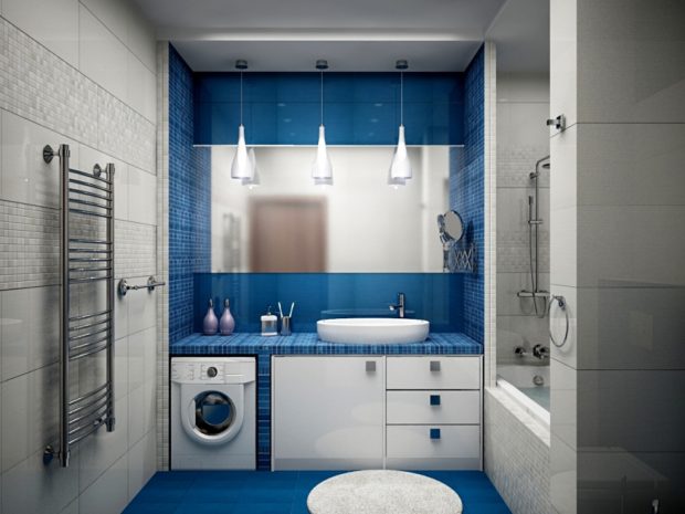 Dans la conception petites salles de bain n'abusez pas beaucoup de bleu. Mieux vaut donner la préférence éléments de décoration ou textile. Une grande serviette de bain accrochée à un rond chromé porte-serviettes chauffant aura l'air très élégant. Après tout, le bleu se combine généralement avec succès avec le métallique. Pour qu'un tel élément ne semble pas solitaire et spontané, composition de support accessoires de salle de bain bleu et un panier à linge. Vous pouvez également diversifier légèrement les murs clairs en utilisant une bordure en verre bleu autour du périmètre. Même un si petit élément rafraîchira la pièce et créera une ambiance complètement différente.