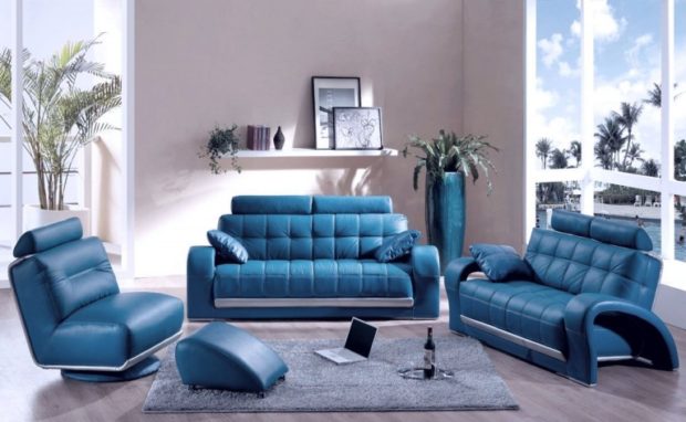 N'oubliez pas que le bleu peut être non seulement des surfaces familières, mais meubles rembourrés. Luxueux bleu le canapé, qui prendra sa place d'honneur contre un mur léger, zeste toute la pièce. Les oreillers peuvent être de n'importe quelle couleur, mais il vaut mieux avoir quelque chose en commun avec couleur du rideau ou d'autres éléments décoratifs. Bleu marine moquette combiné avec des murs plus légers créera une atmosphère confortable et légèrement mystérieuse. Et si votre salon pénètre doucement dans le hall et a des dimensions impressionnantes, vous pouvez utiliser des meubles aux couleurs chocolat noir. Un tel intérieur a l'air très noble et solide.
