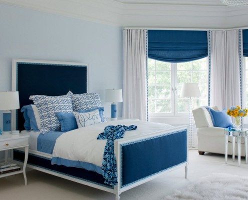 Si votre la pièce est petite, puis en peignant un des murs, de préférence le plus étroit, en bleu, vous pouvez donner les locaux profondeurs et agrandir visuellement l'espace. Il a l'air très bien à la tête de lit les lits, surtout si un lit blanc est installé à l'arrière-plan. Généralement combinaison plusieurs nuances de bleu avec blanc bien adapté pour la chambre et est réel salut pour étroit et petites pièces. Dans ce cas les sols doivent être de couleur neutreà.