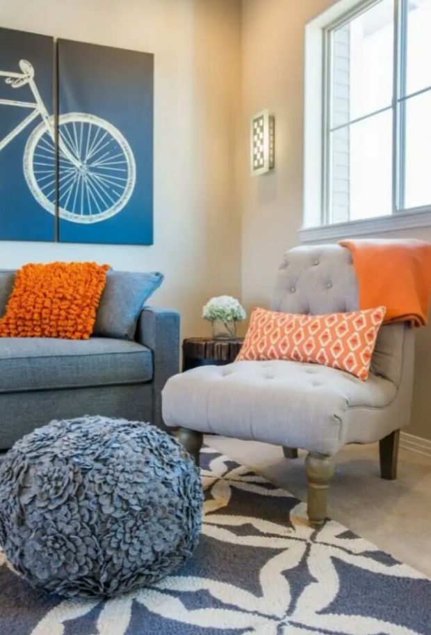 - Bleu + orange ou jaune. On peut dire que c'est l'un des plus inattendu mais en même temps, très combinaisons réussies. Dans ce cas, n'utilisez pas de nuances vives d'orange, car elles fatigueront votre vue, mais les nuances atténuées créeront un intérieur tropical. Bonnes teintes pour la combinaison, il y aura la pêche, la citrouille, l'ambre ou le saumon. Mais le bleu, au contraire, doit rester brillant pour ne pas se perdre, peut-être même le bleu vif.
