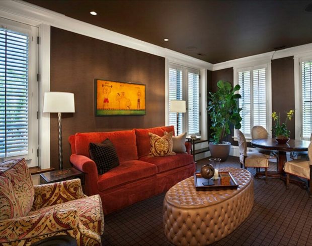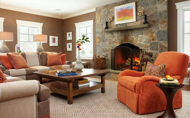 - Marron + rouge ou orange. Ces couleurs parfaitement compléter les uns des autres et créer un arrêt équilibré et confortable. Au milieu de l'orange en sourdine les murs chic semble sombre large plinthe et sombre cheminée combiné avec des meubles plus légers. Un sexe peut être fait dans n'importe quelle nuance de brun. Si une telle décision est trop audacieuse pour vous, échangez simplement les éléments. Utilisez des tons rouges et oranges dans éléments de décoration meubles ou meubles rembourrés individuels. Rideaux et moquette, sur lequel un ornement discret sera présent, s'intègre également bien à l'intérieur marron. Soit dit en passant brun foncé les meubles semble toujours plus cher et plus sain, et pour une raison quelconque, inspire un sentiment de fiabilité et de durabilité.