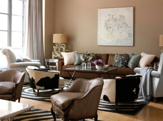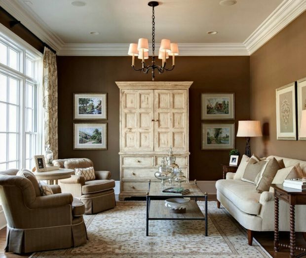 - Marron + blanc "cette composition est depuis longtemps considéré comme un classique ce qui donne à la pièce solidité et respectabilité. Et sur fond de tons sombres de brun, la couleur blanche est pleinement révélée, remplissant la pièce de fraîcheur et d'espace, la rendant plus légère et plus volumineuse. Pour ceux qui trouvent cette combinaison banale et ennuyeuse, l'option utilisation de meubles simples couleurs vives par exemple fauteuils ou tabouret rembourré avec un rembourrage brillant ou d'autres éléments saturés. Ils peuvent être brillants lampadaires ou des peintures murales. Alors tu ne casse pas harmonie de l'environnement mais la ressusciter un peu. Lorsque le blanc domine, la pièce apparaîtra plus grande qu'elle ne l'est. Les murs blancs dissoudront les bordures et les meubles sombres sur leur fond créeront un contraste agréable et non coupant.
