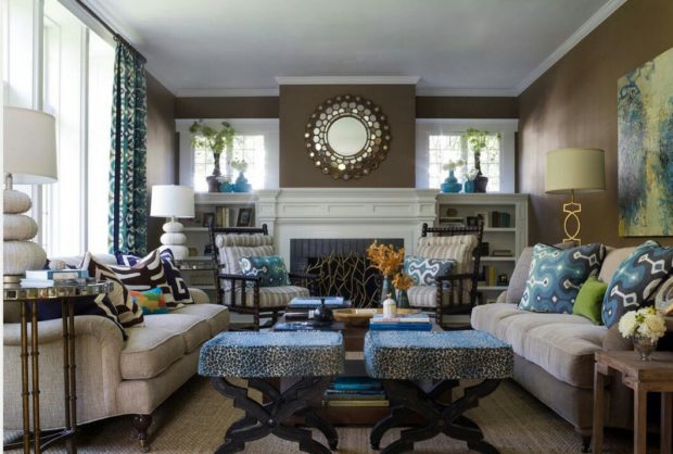 Les salons sont magnifiques notes turquoises. Ils apportent un certain luxe et mystère à l'intérieur de la pièce. Dans une telle couleur peut être faite comme des détails mineurs, par exemple, plusieurs rayures sur papier peint et une paire d'oreillers, et une chaise entière ou un grand tapis pour tout le périmètre. Ce sera très approprié utiliser grand miroirs pour inscription un des murs dans une pièce marron. Ils sont visuellement va augmenter elle l'espace.