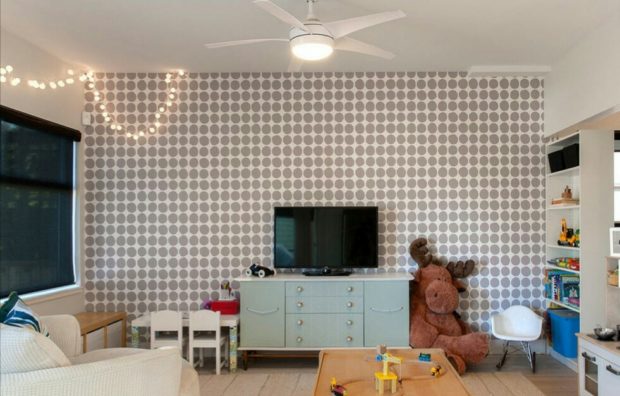 - Si surgi la nécessité de combiner une teinte inhabituelle meubles avec la couleur des murs, mais le blanc semble trop froid et répugnant.À ces fins, une finition gris pâle est choisie pour un mur, contre lequel l'objet sélectionné se tiendra. Pour éviter l'effet inhibiteur, il est autorisé d'utiliser papier peint discret, du même type un ornement.