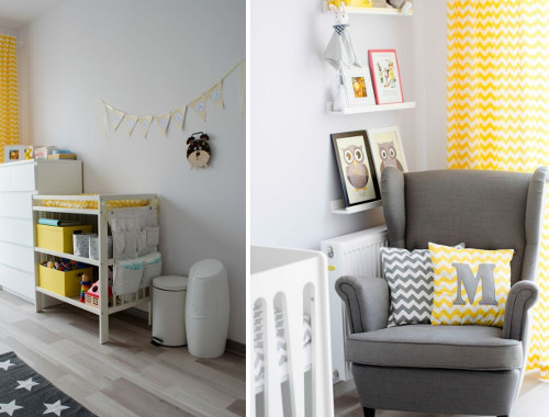 - Si nécessaire dans une chambre créer confortable le cadre pour bébés hétérosexuels. Dans ce cas, la pièce est divisée en deux parties égales à l'aide d'articles décoratifs de couleurs distinctives. Vous n'aurez pas de difficultés avec une combinaison de nuances, et le gris dans ce cas deviendra presque invisible, tout en mettant l'accent sur les éléments de couleur.