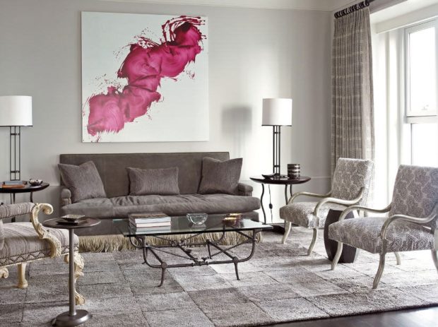 Regardez spectaculaire des meubles simples d'une couleur qui doivent être soutenus par un petit nombre d'objets décoratifs. Il peut s'agir de plusieurs petits vases ou d'un abat-jour. Dans les intérieurs moins audacieux, le gris n'est présent que comme un petit accent. Par exemple, dans le contexte d'un rembourrage léger, des oreillers avec des taies d'oreiller grises sont utilisés. Ou gris sur fond de mur lumineux fauteuil. Ces la réception aide un peu adoucir influencer les teintes saturées et les apaiser. Toute utilisation de nuances de gris dans le salon sera donner le calme souhaité et la noblesse à son intérieur.