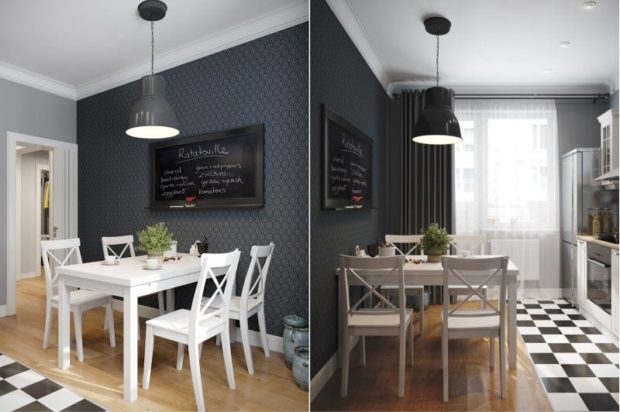 - Gris + noir + blanc. C'est classique intemporel qui est toujours activement utilisé pour décorer les salons ou les salles à manger. Un design noir et blanc strict, complété par des nuances de gris, prend instantanément un look complètement différent. La pièce devient plus confortable volumineux et harmonieux. Si l'espace de la pièce permet, vous pouvez peindre tous les murs dans votre nuance de gris préférée, choisir des meubles avec un revêtement noir et utiliser du blanc dans les éléments textiles et la décoration. Si la pièce est petite mais vous avez vraiment aimé cette option, utilisez le gris pour finitions de plancher et compléter l'image rideaux gris et de petits oreillers unis et à motifs. Le contraste nécessaire ajoutera de tels éléments sur le fond de la tapisserie d'ameublement blanche. Les murs il est préférable de faire des nuances claires et d'en faire un distinctif - gris. Dans ce cas, le noir doit être utilisé comme couleur d'accentuation. Par exemple, le noir peut être nuances lampadaires, cadres photo, une petite table basse ou une petite tapis. Un tel intérieur sera très calme et élégant. La chose principale – fournir bon éclairage si les tons sombres prévalent.