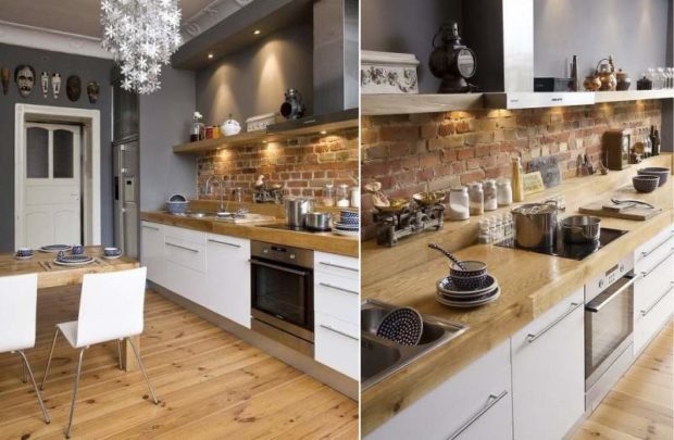 En raison du fait que nuances gris clair visuellement augmenter l'espace et ne cachent pas l'éclairage, ils sont parfait option de finition petites cuisines. Cette couleur peut être utilisée comme base pour décoration murale et les sexes. Dans un tel contexte, les meubles de cuisine de n'importe quelle couleur se présenteront harmonieusement. Et les poignées et autres éléments chromés seront parfaitement combinés avec eux. Les appareils électroménagers, dont la surface est en acier inoxydable, dans ce cas, vont même décorer l'intérieur. Pour la décoration murale Les papiers peints avec un motif de lumière discret ou texturés pour la peinture sont les mieux adaptés. Nuances sombres ne peut être utilisé que dans des cuisines spacieuses et bien éclairées. Pour ce faire, un mur, en face duquel se trouvera la salle à manger, est attribué à l'aide de de papier peint.