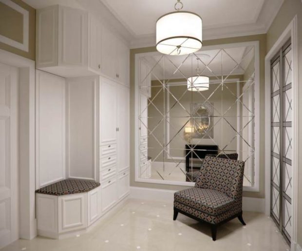 Pour dressing surtout si elle est assignée taille modeste, en finissant un des murs avec des carreaux de miroir complètement, double avantage. Il y aura beaucoup plus d'espace et le besoin d'un miroir ordinaire disparaîtra immédiatement. Dans ce cas, vous pouvez combiner deux types de tuiles. Par exemple, au milieu du mur du sol au plafond, disposez le miroir habituel et sur les côtés - une tuile avec des motifs.