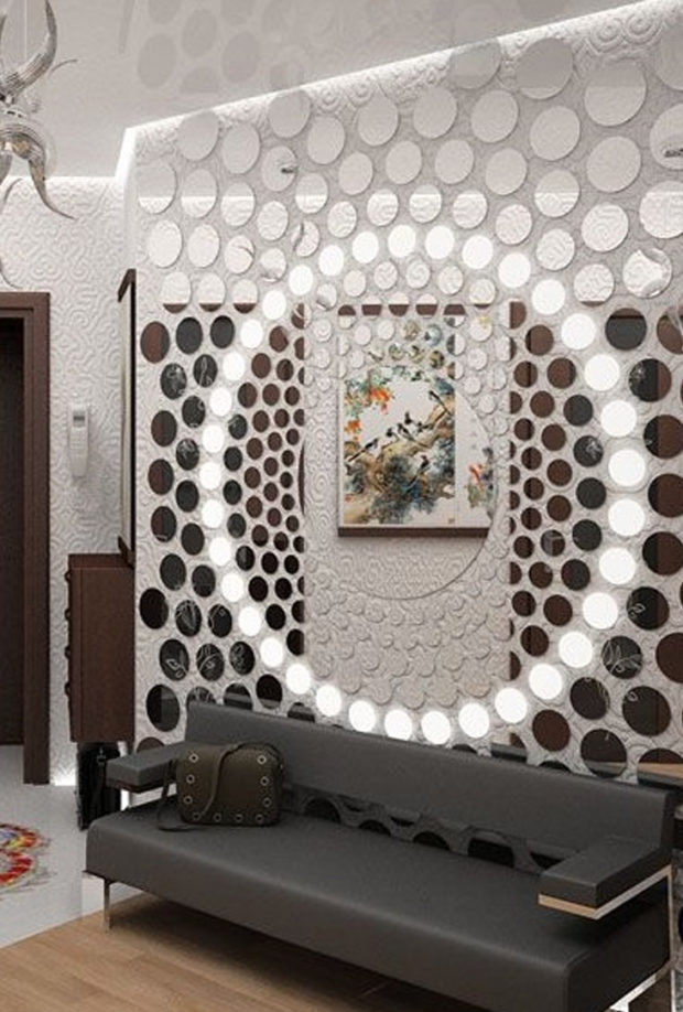 Les designers adorent travailler avec ce type de matériau. Tout cela grâce au fait qu'avec son aide, vous pouvez instantanément changer l'intérieur de la manière la plus incroyable.Même de petits fragments peuvent apporter une nouvelle humeur à l'atmosphère de la pièce. La surface la plus courante pour traduire des idées est bien sûr le mur. Mais beaucoup recommandent d'utiliser des éléments réfléchissants au plafond et même au sol.