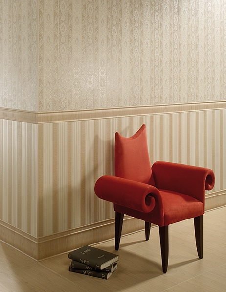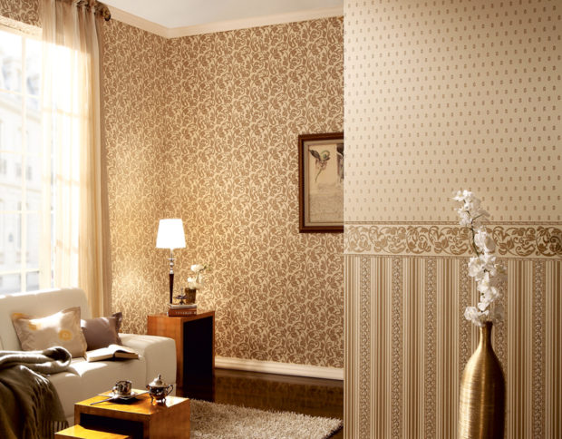 Une telle combinaison donnera du calme et de l'ordre à la pièce saturée de motifs. Dans ce cas, la frise doit refléter la couleur minoritaire sur le papier peint principal. Vous pouvez donc éviter la sursaturation d'un ton. La largeur de la bande est choisie à partir de l'option de son emplacement sur le mur, dont nous parlerons un peu plus tard. Une chose est sûre, une bande trop étroite sur le fond de grands éléments de l'image aura l'air ridicule et sera simplement perdue. S'il y a de la nacre sur le papier peint, vous pouvez prendre un ruban monophonique pour le faire correspondre. Ainsi, il semblerait que le papier peint ordinaire avec ornement acquiert charme et sophistication. Habituellement, dans de tels cas, une bordure en or ou en argent est utilisée.