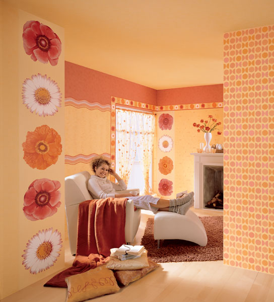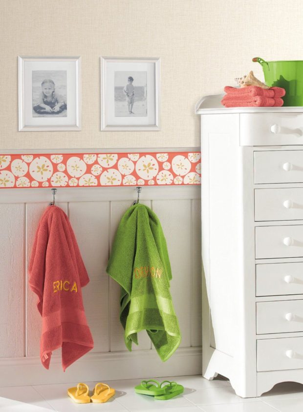 Il existe de nombreuses options pour de telles bordures, parfois elles peuvent être faites sous la forme de grandes fleurs, d'oiseaux inhabituels ou d'inscriptions. Avec l'aide d'un tel élément, l'intérieur semblera plus réfléchi et complet. Une autre option pour le placement horizontal est directement au-dessus du sol. Dans ce cas, la bordure peut avoir une largeur de 20-30 cm et être réalisée sous forme de jeune herbe avec des primevères ou tout simplement avoir un motif intéressant. - Vertical l'orientation est particulièrement pertinente si vous souhaitez mettre en évidence mur souligné. Il peut s'agir d'un mur de couleur distinctive, bordé autour du périmètre d'une bordure avec un ornement en couleur avec les murs principaux. Ou, inversement, un mur avec des motifs et une bordure monophonique claire. Dans tous les cas, une telle décision aura une apparence plus expressive et soignée. Après tout, vous indiquerez non seulement clairement les limites, mais masquerez également les joints ou les coupures dans les coins, où il est magnifiquement difficile d'accomplir cela. Surtout sans préparation de surface appropriée avant cela. La bordure verticale peut également être merveilleusement située sur le plan d'un long mur à l'endroit où se trouvent des papiers peints de toutes sortes.