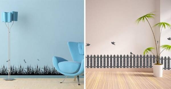 Il existe de nombreuses options pour de telles bordures, parfois elles peuvent être faites sous la forme de grandes fleurs, d'oiseaux inhabituels ou d'inscriptions. Avec l'aide d'un tel élément, l'intérieur semblera plus réfléchi et complet. Une autre option pour le placement horizontal est directement au-dessus du sol. Dans ce cas, la bordure peut avoir une largeur de 20-30 cm et être réalisée sous forme de jeune herbe avec des primevères ou tout simplement avoir un motif intéressant.