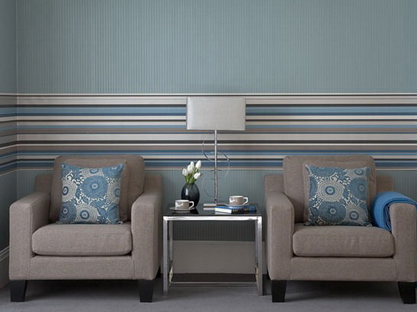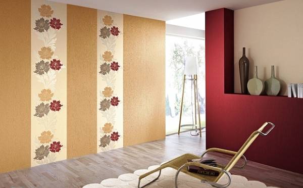 Le papier peint avec une image semble toujours plus expressif et intéressant, mais il y a des moments où décorer toute la pièce de bas en bas avec des toiles colorées inacceptable. C'est particulièrement vrai petites pièces. Vous courez le risque de les rendre visuellement encore moins spacieux et étouffants. Dans ce cas, n'abandonnez pas complètement votre fond d'écran préféré avec une photo. Vous avez juste besoin de les utiliser en plus petites quantités. Une option populaire est la conception du bas du mur avec de telles peintures et du haut - en uni, pastel ou de la même couleur, mais sans motif. L'endroit où il y aura une jonction de deux variétés de papier peint doit être caché soit ruban uni couleur distinctive soit avec le même modèle mais ayant une orientation différente, comme dans l'exemple ci-dessous, les murs ont l'air si harmonieusement conçus de cette façon dans les salons ou les chambres.