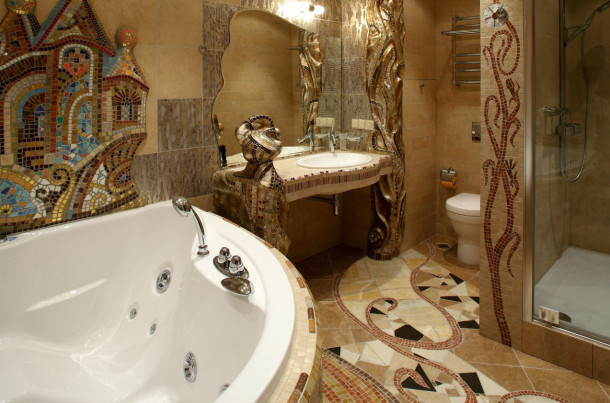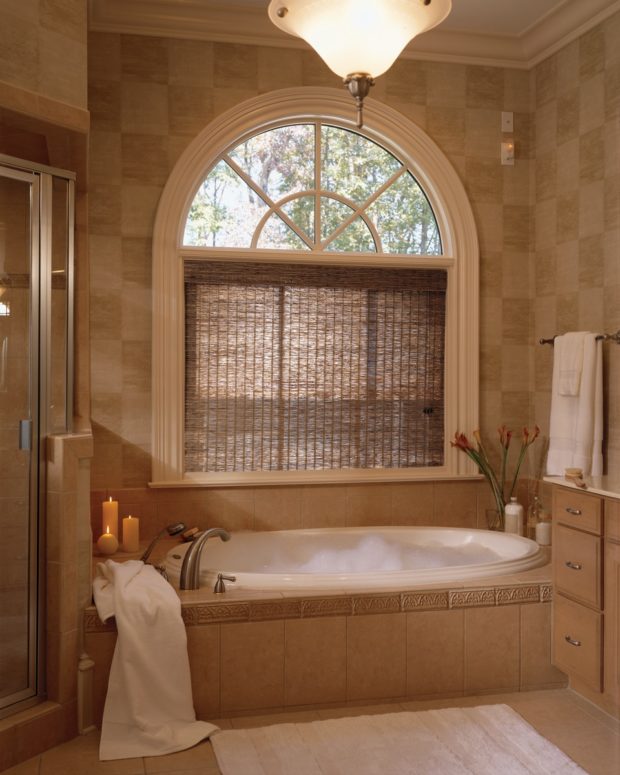 Les ouvertures de fenêtre de cette forme se distinguent par un charme et un mystère particuliers. Vient immédiatement à l'esprit l'image d'un luxueux château médiéval ou d'intérieurs romantiques dans la méditerranée et indien style. Vous pouvez soutenir l'une des idées et concevoir la salle de bain de la même manière. Il est préférable de transmettre l'atmosphère d'un vieux château finir de naturel ou pierre artificielle et bois vieilli. Ces pièces sont caractérisées par une douce lumière tamisée. Sur les étagères murales, vous devez placer des bougies dans de magnifiques bougeoirs en cuivre. Peut accrocher lustre sous la forme de nombreuses bougies situées sur un cercle en bois. Le comptoir ou l'armoire sous le lavabo doit avoir un aspect massif et ressembler à de vieux meubles en bois. Pour un tel intérieur en cuivre ou en laiton robinets et porte-serviettes dans le même style. Une attention particulière doit être accordée à ces bagatelles afin d'obtenir un intérieur holistique et harmonieux.