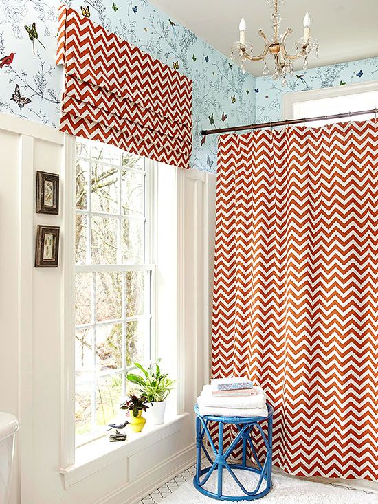 - Si vous utilisez un rideau pour la salle de bain, vous pouvez choisir un motif ou une couleur similaire pour décorer la fenêtre.