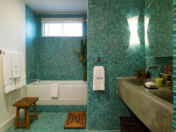 Conception de salle de bain avec une ouverture de fenêtre ne doit en aucun cas être trop fantaisiste. Après tout, la fenêtre de la pièce sera l'élément principal. Style de chambre il est plus raisonnable de sélectionner en fonction du paysage à l'extérieur de la fenêtre. S'il s'agit d'une bande verte ou d'un petit réservoir, le compléter avec succès aidera l'intérieur dans style éco. Cela implique l'utilisation de matériaux naturels et respectueux de l'environnement. Son schéma de couleurs répète pleinement les nuances naturelles de la nature elle-même - les verts frais des jeunes feuilles, l'écorce des arbres, les nuances terreuses et la palette de sable seront prédominants. Les murs et sexe peut être confronté tuile, dont la surface en couleur et en texture imite le bois ou la pierre naturelle. Pour atténuer la situation peut être placé devant bain ou salle de douche tapis moelleux teinte vert tendre. Dans un tel intérieur, les éléments en verre semblent très harmonieux. Que ce soit étagères murales ou un plateau en verre trempé.