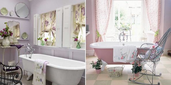 Pour créer intérieur romantique vous devez utiliser tout ce qui est léger et aéré au contraire. Le revêtement des murs et des sols implique l'utilisation de teintes pastel claires. Les meubles doivent être plus soignés et élégants. Ils peuvent être réalisés en blanc ou en bois clair. Des formes plus lisses seront plus appropriées. Une baignoire d'une forme douce sur de belles jambes en métal s'intégrera bien dans une composition si douce. Les murs peut être décoré d'étagères en verre de taille modeste et y déposer des petits vases avec des fleurs. Des couleurs chaudes aideront à rendre l'intérieur plus confortable et rêveur. Vous pouvez accrocher un rideau en apesanteur sur l'ouverture de la fenêtre, si nécessaire, ou fermer sa partie inférieure avec un chiffon en lin. N'oubliez pas tapis confortable à l'étage devant la salle de bain. Une telle pièce sera fraîche et pleine de lumière.