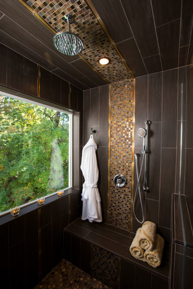 Examinons plus en détail l'option de placer la fenêtre au niveau familier. Si la vue vous convient parfaitement, alors en choisissant le style de la salle de bain, vous pouvez en tirer parti. Si tu veux mettre en évidence fenêtre ouverture et mettre en valeur le paysage derrière son verre, choisissez des matériaux de finition légers qui ne vous distraireont pas. L'ouverture elle-même peut être distinguée en utilisant un matériau sombre pour le cadre de la fenêtre. Cette technique fonctionne bien en combinaison avec l'obscurité chambranles autour de la porte ou sombre feuille de porte. Vous donnez donc du volume intérieur, apportez un contraste modéré, mais ne le rendez pas trop sombre et sombre.