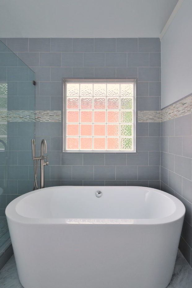 Si la vue de la fenêtre vous agace ou regarde constamment dans vos fenêtres, vous devez vous assurer que ce qui se passe à l'intérieur n'est pas visible à travers la fenêtre. Le suspendre avec des rideaux aveugles ou des volets est une entreprise stupide. Après tout, vous vous priverez ainsi que de la source de lumière et de ventilation naturelle. Peut remplacer transparent tissu de verre sur givré, ou posez l'ouverture de la fenêtre avec blocs de verre. Et en cela, et dans ce cas, vous profiterez pleinement de la fenêtre de la salle de bain, mais la rendre inaccessible aux regards indiscrets. C'est clairement plus rationnel que de le serrer avec briquesDe plus, ce design a l'air assez moderne et élégant. Blocs de verre peut avoir une teinte et un motif différents à sa surface. Cela aidera à ne pas gâcher, mais complétera plutôt l'atmosphère.