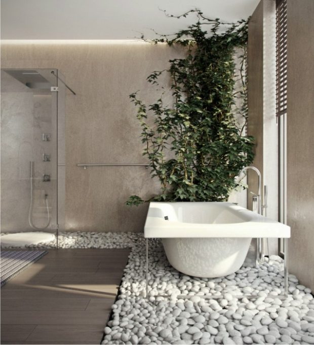 Comme éléments décoratifs, vous pouvez utiliser de petits vases en verre avec de vrais galets de rivière. Et si vous aimez vous détendre seul avec vous-même, aménagez-vous un petit coin salon devant la fenêtre. Il peut s'agir d'un banc en bois, qui sera une continuation de la salle de bain, des tapis moelleux et des petits oreillers y seront placés. Lors du choix d'un tissu, gardez à l'esprit qu'une humidité élevée se reflète mal dans les fibres naturelles. Il est préférable de privilégier un matériau avec une petite quantité de fil synthétique. À proximité, placez une palette avec du vrai sable et un râteau décoratif.Vous pouvez maintenant profiter de la vue depuis la fenêtre et dessiner sur du vrai sable. Sous le banc de fortune, placez le rétro-éclairage et saupoudrez de gros cailloux de rivière. Galets peut être utilisé pour le revêtement mural et au sol, ainsi que sous un plan de travail en verre. Aucun de vos invités, et vous-même, ne voudra quitter une telle salle de bain.