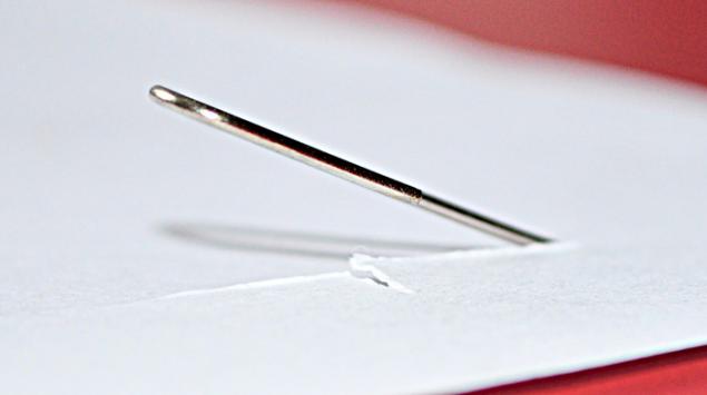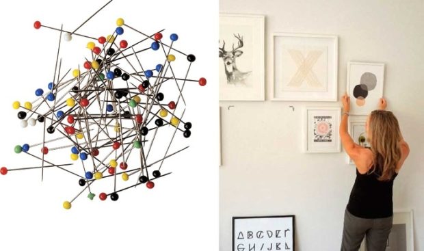 Épingles à coudre - L'une des méthodes de montage les plus précises, ce qui provoque le moins de dommages à la surface des murs. Appuyez la photo contre le mur et percez-la avec une épingle légèrement inclinée par rapport au plan du mur. Sa jambe doit aller derrière le papier peint, mais ne pas coller au mur. Au lieu d'épingles, vous pouvez utiliser une aiguille à coudre ordinaire. Elle sera moins visible. Ces attaches sont capables de supporter un poids allant jusqu'à 500 grammes.