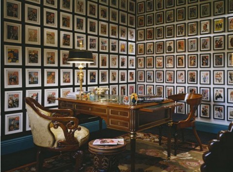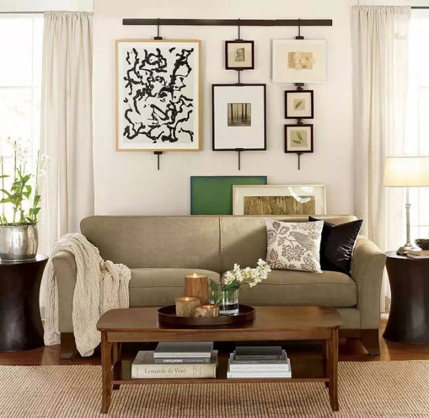 Cette méthode est utilisée quand ce n'est pas dommage pour le sol et le plafond, mais dommage pour le mur. Veuillez noter immédiatement que si vous avez une suspension ou plafond tendualors cette méthode n'est pas pour vous. À moins, bien sûr, que cela n'ait été prévu à l'avance. Il convient de noter que l'utilisation d'un mur séparé entier pour placer des objets aidera à réaliser des solutions intérieures uniques. Une telle planche peut devenir le centre de la pièce et définir le reste de son environnement. Des compositions plus harmonieuses et réfléchies conçues pour parler de quelque chose. Par exemple, une série de photos de paysages prises à différents moments de l'année qui transmettent les moments les plus lumineux de chaque mois et racontent l'histoire du flétrissement et de la renaissance de la nature. Ou une série de portraits en noir et blanc d'un couple marié, qui retrace l'histoire de leur connaissance et les moments les plus marquants. Ou l'histoire de grandir votre bien-aimé. Souligner un tel élément est très simple à l'aide de spots. Et construire un tel design est encore plus facile. Vous pouvez utiliser de vraies planches en bois, tricotées dans une seule toile de la taille souhaitée. Des options plus abordables incluent l'utilisation de panneaux de particules stratifiés ou sablés ou de MDF. Vous pouvez peindre la surface vous-même dans une couleur appropriée. Pour le montage, des supports spéciaux sont requis, qui sont vendus dans n'importe quelle quincaillerie.