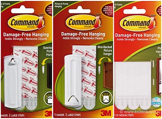 La beauté de ces velcro est qu'ils peuvent être facilement enlevés sans endommager la surface des murs et réutiliser contrairement au ruban adhésif double face. Il existe plusieurs types de configuration qui diffèrent selon le poids autorisé. Le plus petit équipement est 4 jeux de 8 petites bandes. La moyenne comprend 3 séries de 6 bandes. Dans le premier cas, un Velcro peut supporter 100 g et l'ensemble entier - 450 g. Dans le second cas, le Velcro peut supporter 400 g et l'ensemble entier - charge jusqu'à 1 kg. Pour démonter ou l'emporter sur l'image, il vous suffit de retirer la bande blanche du système.
