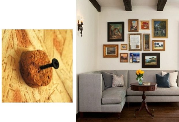 Cet article servira de couche entre le mur et l'image, dans laquelle vous pouvez facilement visser une petite vis autotaraudeuse et accrocher quoi que ce soit dessus. Il est nécessaire de couper le bouchon en liège de 1 à 1,5 cm d'épaisseur, à l'aide d'un couteau de bureau bien aiguisé. Collez le cercle résultant sur le mur avec une colle fiable. Après séchage complet, prenez une courte vis autotaraudeuse et vissez-la simplement dans le bouchon. Les éléments filetés tiendront fermement dans une telle structure. Il suffit de choisir un bouchon très étanche. Le silicone pour le vin convient également. La fiabilité dépendra de la colle sélectionnée.