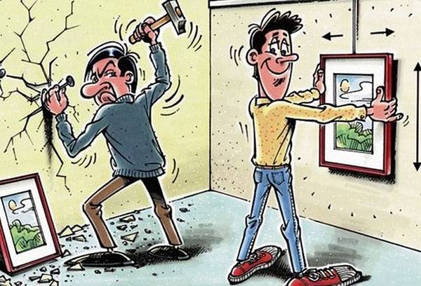 N'oubliez pas qu'il n'est pas suffisamment fiable pour fixer l'image au mur - cela doit être fait relativement exactement. Seuls les objets correctement placés créeront une atmosphère harmonieuse. Pour cela, ne négligez pas niveau du bâtiment ou en marquant immédiatement avant de commencer le travail.