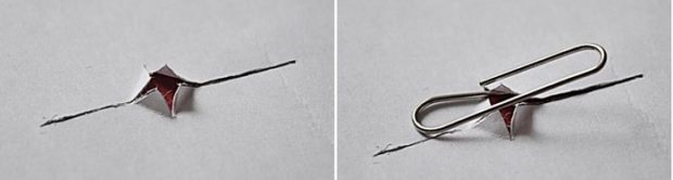 Trombone peut également se transformer rapidement et facilement en une attache pour les peintures ou les cadres légers. Pour ce faire, vous devez le refaire un peu.Nous collerons le trombone sous le papier peint comme dans la version précédente. Seule la coupe sera un peu différente. La ligne horizontale doit dépasser légèrement la longueur du trombone et la ligne perpendiculaire doit être légèrement plus grande que sa largeur. Une incision transversale est nécessaire pour un trombone gratuit. Les bords doivent être pliés et décollés du papier peint du mur sur toute la longueur de l'incision. Le trombone lui-même doit être déplié pour ressembler à la lettre «L». C’est comme si vous l’aviez attaché avec une grande pile de papiers, puis retiré.