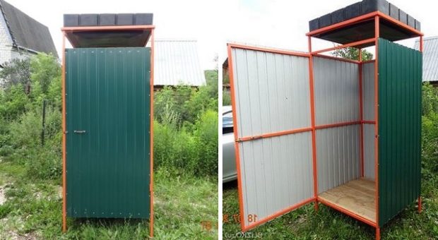 Un autre matériau réussi pour couvrir la douche d'été est le carton ondulé. Ce matériau est élevé durabilité et durabilité combiné avec légèreté. Il est coupe-vent. Et lorsque ses murs sont chauffés tout au long de la journée, il sera confortable de prendre une douche. En tant que cadre, des poutres en bois et des profilés métalliques peuvent être utilisés. Le métal, bien sûr, est plus durable. Par conséquent, si vous avez encore besoin d'acheter du matériel, privilégiez-le.