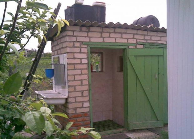 Après que le mortier sèche et s'installe, après environ une semaine, vous pouvez commencer à poser la première couche de briques. Lors de la pose, assurez-vous de contrôler la verticalité après chaque nouvelle ligne. N'oubliez pas de laisser de la place pour la porte. En posant la dernière couche de briques, faites des hypothèques à partir de grosses poutres en bois. Un réservoir leur sera attaché et un toit sera posé. Il est également nécessaire de renforcer la porte avec un coin métallique ou la même poutre. Le toit est couvert ardoise ou carton ondulé. Il est nécessaire de prévoir une petite fenêtre, qui fournira l'éclairage et la ventilation.