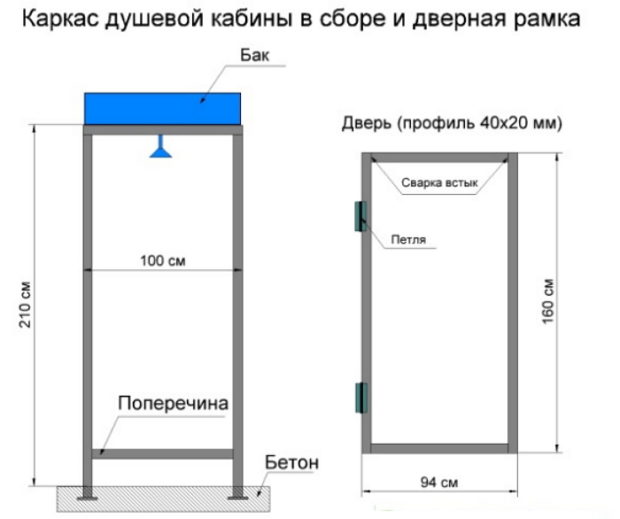 Le polycarbonate est couramment utilisé pour créer serres. Par conséquent, pour beaucoup, ce matériau est associé à l'effet de serre et, par conséquent, à des inconvénients. Cette opinion est erronée. Pour créer des douches, il y a une spéciale, opaque vue du polycarbonate. Le plus durable sera la construction, qui est faite de profils métalliques. Travailler avec eux n'est pas plus difficile qu'avec des barres en bois. Un tube profilé d'une section transversale de 40 × 20 mm et d'une épaisseur de paroi de 2 mm convient à la construction d'un cadre. A toi aussi sera nécessaire angle en acier 50 × 50 mm. Le nombre de profils est déterminé en fonction de la zone de la future âme. La seule chose à considérer lors de la coupe - les paniers doivent être de 10 à 15 cm de plus que la hauteur estimée de la douche. Cela est nécessaire pour que vous puissiez les bétonner et ne pas perdre de hauteur. Plan de travail ressemblera à ceci: