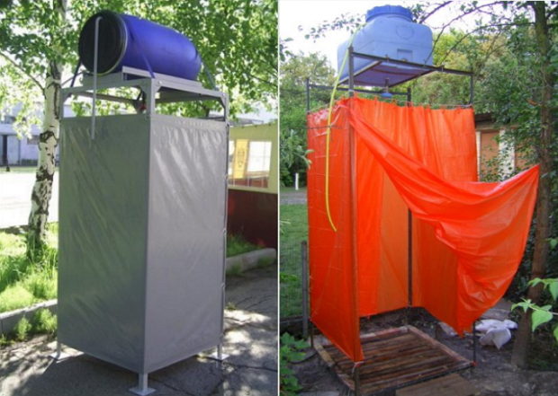 Optimal taille du réservoir est d'au moins 200 litres. Avec celui-ci sur le toit, prévoyez un trou pour le tuyau d'entrée sur lequel la pomme de douche sera enroulée. Il peut être acheté ou fait maison. En utilisant un réservoir chauffé, n'oubliez pas la fourniture d'électricité. Si vous n'êtes pas fort dans ce domaine, alors pour votre propre sécurité, demandez l'avis ou l'aide de spécialistes. Vantail de porte peut être en bois ou OSB ou panneaux de particules, gainé de tôle galvanisée. Ainsi, vous vous offrirez des conditions confortables pour l'adoption des procédures de l'eau à tout moment de l'année.