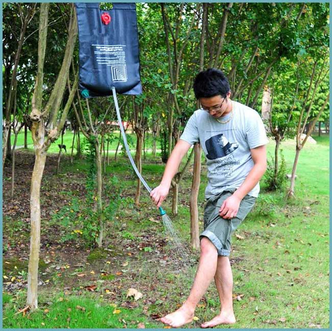 - Douche portable. Cette conception ressemble à un grand coussin chauffant et est faite du même matériau. Après avoir rempli le réservoir d'eau, il est tordu avec une buse spéciale, à la fin de laquelle il y a mini arrosoir. À l'extrémité opposée, il y a une boucle pour laquelle il est pratique de suspendre le récipient sur un arbre ou un crochet. En plaçant le récipient dans un endroit bien éclairé, l'eau se réchauffe très rapidement.Le volume d'une telle "douche" est de 10 à 15 litres. Cela implique des restrictions sur la durée des procédures de l'eau et le nombre de personnes qui peuvent l'utiliser. Mais c'est une option très pratique et peu coûteuse pour une personne.