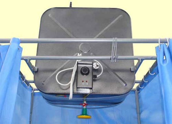 - Réservoir en acier galvanisé conçu pour les douches basses. Il a une forme plate et une courte pomme de douche intégrée. Son volume est de 100 et 200 litres. Un tel réservoir fonctionne par type chaudière et a besoin d'un approvisionnement constant en eau.