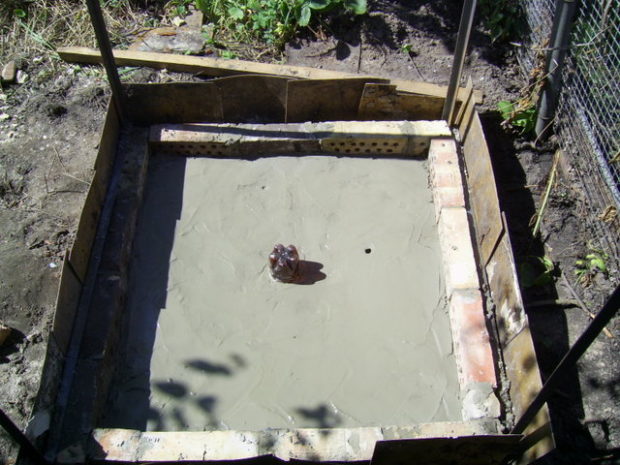 - Une fois le cadre assemblé, une fosse de la taille requise est creusée. La terre végétale est retirée à une profondeur de 10 à 15 cm, la chape en béton est nivelée et coulée. Dès que la chape est inondée et nivelée, il est nécessaire d'installer le cadre assemblé sur le dessus afin que les racks, qui étaient à l'origine plus longs, soient immergés dans béton. Le niveau vérifie la verticalité de la structure installée et ajuste si nécessaire. Si la longueur des pieds dépasse la hauteur de la chape en béton, ils doivent être enfoncés dans le sol jusqu'à ce qu'ils soient complètement immergés.