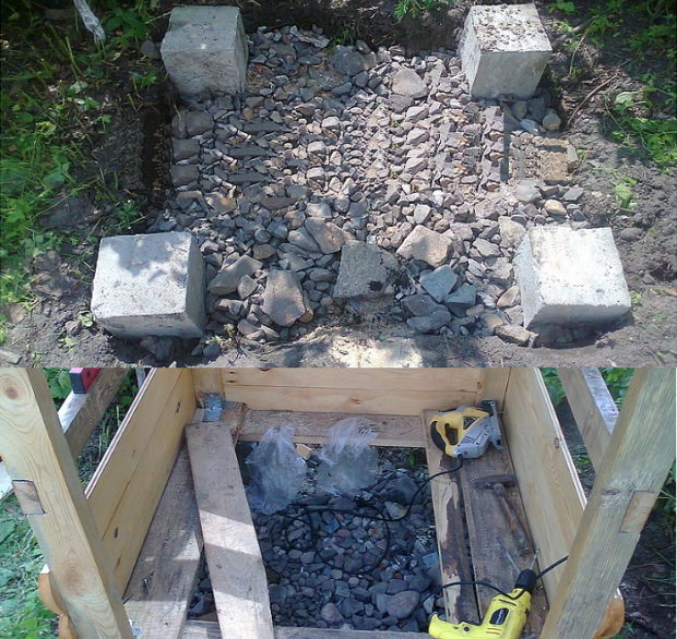 La construction commence par l'aménagement d'une fosse pour l'évacuation de l'eau. Il est nécessaire d'enlever la couche supérieure du sol avec une profondeur de 30-40 cm et de remplir de pierre concassée. Ainsi, le sol sous la douche absorbera rapidement l'eau et les résidus de savon resteront sur les décombres. Maintenant, vous devez faire coffrage pour protéger le bois de la pourriture. Aux coins de la fosse dans l'ajustement de niveau parpaings ou des briques. La hauteur du coffrage doit être d'au moins 15 cm.