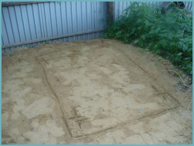 Selon le marquage, vous devez creuser un trou d'environ 30 à 35 cm de profondeur, vous devez faire des hypothèques autour du périmètre du rectangle. À ces fins, vous pouvez utiliser de vieux tuyaux en fer. Plus leur diamètre est grand, plus la structure sera solide. À l'emplacement des tuyaux à l'aide d'une perceuse, un trou est creusé jusqu'à une profondeur de 30 cm, dans lequel les tuyaux ou les poutres en bois sont bouchés. Si vous utilisez un arbre, vous devez protéger sa surface en l'enveloppant avec du matériau de couverture ou en le traitant avec du bitume chaud. Après cela, le mélange ciment-sable est versé. Les hypothèques en bois peuvent être faites non seulement dans les coins, mais aussi sur tout le périmètre de la base. Pour cela, une largeur de bûche suffisante est utilisée, ce qui peut fournir une installation supplémentaire du sol. La base doit être plate. Cela aidera à prévenir l'accumulation d'eau dans les endroits avec des pentes. Le remplissage est effectué selon la technologie d'agencement chape de sol. Utilisez des balises et des règles de construction spéciales.