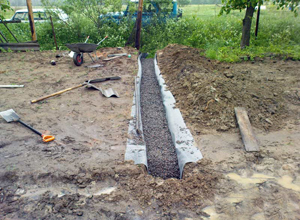 - Pour les types d'âmes plus simples qui ne seront pas utilisés avec une grande intensité, il suffit d'équiper bien drainé. Il sera situé directement sous la douche. Une fosse est creusée, à 2 mètres de profondeur, une couche de gravats est coulée au fond, puis un tuyau en plastique perforé est inséré. Dans un tel puits, du matériel est versé qui servira de filtre. Il peut s'agir de gravier, de gravats, de vieilles briques cassées, de scories. Le puits est rempli jusqu'au sommet, puis recouvert d'une couche géotextile et rempli de terre. Une palette en bois est déjà installée sur le dessus du coffrage, qui a des fentes pour l'eau qui coule. C'est le moyen le plus abordable, mais non moins efficace, qui fournira l'écoulement d'eau nécessaire.