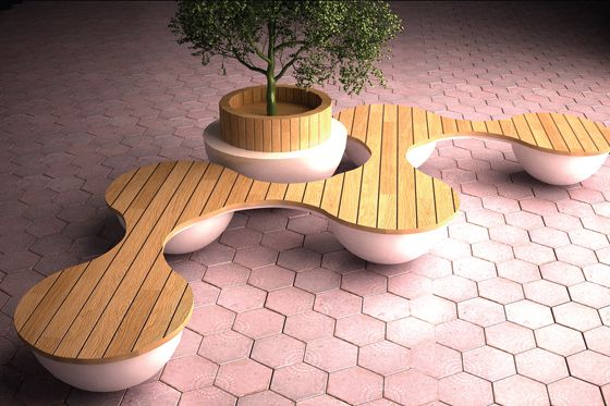 - Banc semi-circulaire - Il présente presque les mêmes avantages et inconvénients que le modèle ci-dessus avec une différence. Le point d'arrondi, où le rayon sera le plus grand, est beaucoup plus pratique à utiliser comme lieu d'assise complet qu'un angle de 90 degrés.
