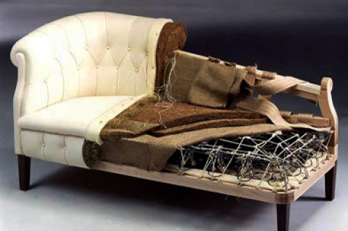 Il ne sert à rien de perdre du temps et de l'énergie à remplacer le rembourrage si le canapé à l'intérieur est endommagé. Un beau tissu ne cachera pas les piqûres qui se forment du fait que la charge perd sa densité. Il ne masquera pas les éléments structurels affaissés qui sont une conséquence du bloc de ressort étiré. C'est pour cela qu'il faut nettoyer complètement le cadre de tout ce qui est superflu - pour que trouver et dépanner. Sous le remplisseur, vous trouverez des ressorts ou des mailles ou des courroies. Tous ces composants, y compris les joints du cadre en bois lui-même, doivent être soigneusement examinés. Si ressorts ceintures tendues éclater et déchirés, et les extensions en métal ou en nylon ne remplissent pas leurs fonctions, il faut tout remplacer par de nouvelles pièces. Très souvent, des ressorts éclatent au milieu du siège.
