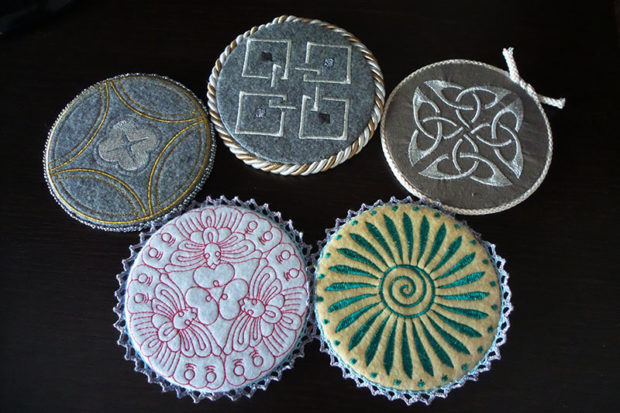 - Une voie pour les vraies femmes à l'aiguille - nous coupons jantes anciennes rayées belles tissu. Pour ce faire, vous aurez besoin non seulement de morceaux de matériaux intéressants, mais aussi d'un carton dense ou d'un hivernant synthétique. À partir de l'un de ces matériaux, vous devez couper deux cercles de la taille d'un disque pour chaque support.Après la coupe, enduisez les deux côtés du disque de colle et fixez les cercles résultants. Cela aidera le tissu à ne pas glisser lors des travaux ultérieurs et à rendre le support plus épais. Maintenant, vous devez couper deux morceaux plus gros du matériau sélectionné pour le décor avec une tolérance d'environ 0,5 cm par couture. Fixez un chiffon, regardez attentivement afin que les bords dépassent uniformément sur le diamètre du disque. Utilisez quelques épingles pour hacher la pièce. Vous devez maintenant coudre manuellement les bords. Si vous pouvez crocheter, vous pouvez tresser un cercle autour du périmètre avec un fil fin et tourner un peu de dentelle. Sinon, ça va, la couture aidera à cacher la bordure décorative. Une fois le travail terminé, il suffit de le coller soigneusement à l'extrémité du support avec un adhésif thermofusible. Vous pouvez faire une petite boucle. Utilisez-le pour accrocher les sous-verres au mur près de la table de la cuisine.