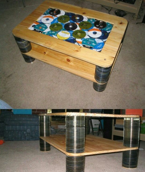 Qu'est-ce que les comptoirs ne font pas tables artisans! Et nous vous proposons non seulement de décorer la table, mais aussi d'essayer faire à part entière cadre à partir de vieux disques et des restes de panneaux de particules ou d'autres matériaux en bois. Pour mettre en œuvre l'option de décoration de table, nous avons besoin des mêmes outils que pour la décoration de pots de fleurs. Et la technologie sera identique. Des fragments de disques ou de disques sont collés sur la surface préparée dans son ensemble, comme vous le souhaitez, puis les lacunes sont comblées jointoiement et verni.