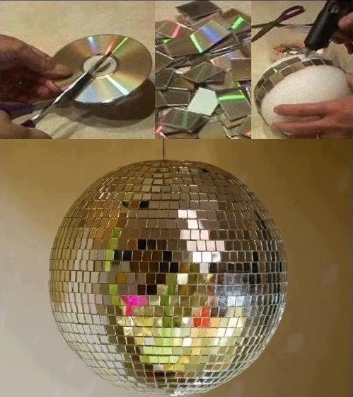 - Le plus simple est de coller sur la vieille boule en caoutchouc avec des fragments de mosaïques miroir. Pour ce faire, la surface de la balle doit être bien lavée et dégraissée. Les disques à ciseaux pointus sont coupés en bandes et en carrés. Maintenant, collez les pièces sur la balle avec le côté miroir orienté vers l'extérieur à l'aide de superglue. N'oubliez pas de fournir une boucle. Pour une plus grande fiabilité, prenez une longue corde plate et attachez-la directement sur la balle. En collant des morceaux du disque sur la corde, vous le sécuriserez pour toujours. Au final, il ne reste plus qu'à nouer les extrémités.