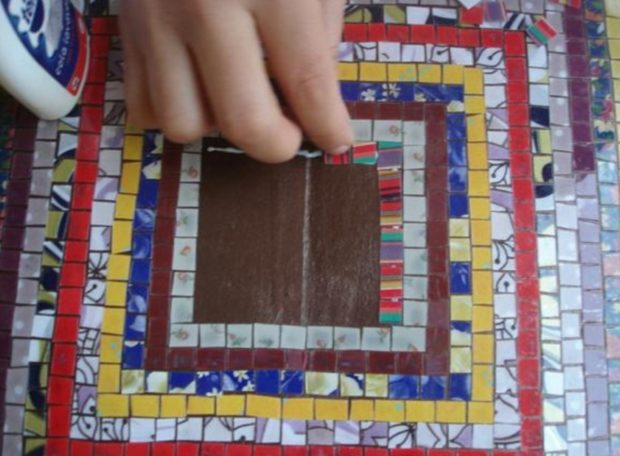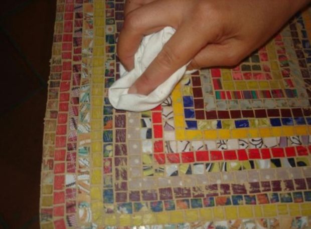 - Mettre le mastic sur la mosaïque et étaler avec une spatule en caoutchouc, en remplissant soigneusement les coutures;
