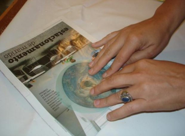 - Étalez une couche décente de colle PVA sur la surface du disque et collez-la sur la page sélectionnée. Cela doit être fait avec tous les lecteurs, donc beaucoup d'images seront également nécessaires.