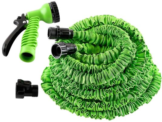 - Extensible Le tuyau est une conception tuyau dans tuyau. Maintenant, le nom populaire de ce type de produit est devenu "Xhose." L'élément intérieur est en caoutchouc caoutchouté, qui possède d'énormes propriétés de traction. Pour l'utiliser de manière pratique, la couche extérieure est constituée de fils de nylon qui limitent le degré d'étirement du tuyau en caoutchouc au bon moment. Grâce au revêtement en nylon, le tuyau n'est pratiquement pas sujet à la contamination, facile à entretenir et a une résistance à l'usure accrue. Il est le plus approprié pour arroser les parterres de fleurs décoratifs avec des fleurs et des plantes délicates ou pour nettoyer la zone avec une pression constante d'eau. Cela est vrai pour les bien équipés chalets. En l’absence de bonne pression, que l'on retrouve souvent dans les chalets d'été, il se peut que vous n'obteniez pas l'effet escompté. Un de plus un obstacle Une surface de sol inégale peut devenir difficile à étirer et ensuite assembler le tuyau. Le tuyau auto-extensible a un poids très léger et est rapidement froissé à des dimensions compactes, ce qui rend son stockage très pratique.